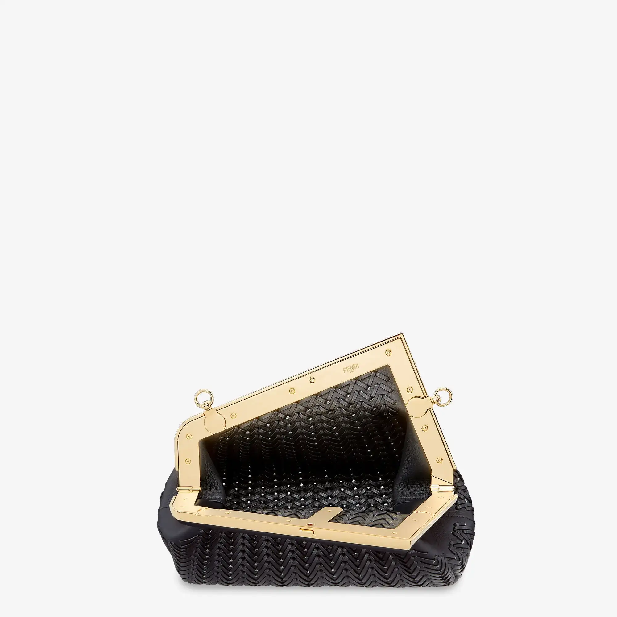 Small Replica Bags Fendi First bag made of finely braided black leather, with an oversized F metal clasp bound intone-on-tone nappa leather.Featuring an unlined internal compartment, pull-out internal attachment points and gold-finish metalware.Can be carried by hand as a clutch or worn on the shoulder thanks to the detachable shoulder strap.Made in Vietnam