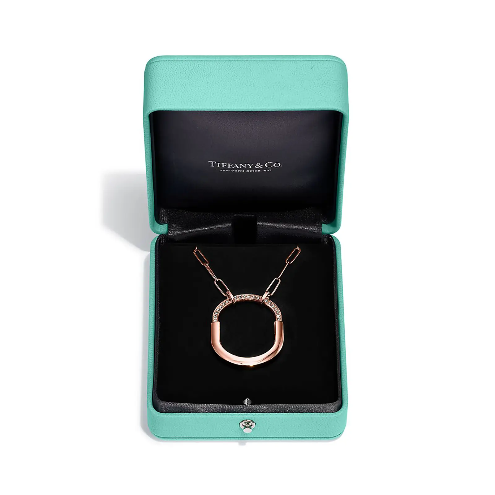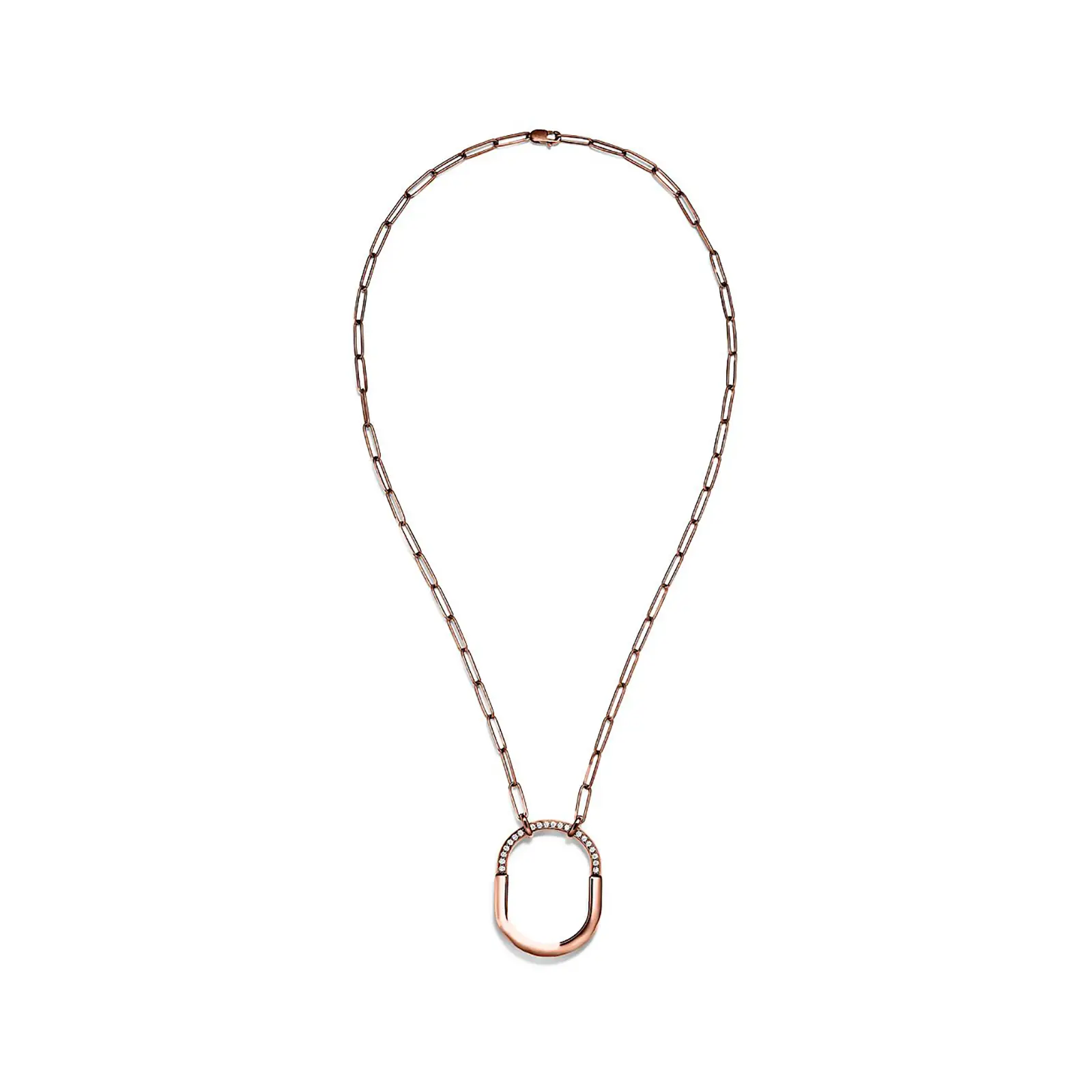 Tiffany Lock is an expression of love’s enduring protection, inspired by a padlock from The Tiffany Archives that dates to 1883. Designed to keep safe that which is cherished, Lock is a universal symbol of what matters most. This pendant features a striking oval link chain that echoes the Lock motif. It’s expertly crafted in 18k rose gold with hand-set diamonds.