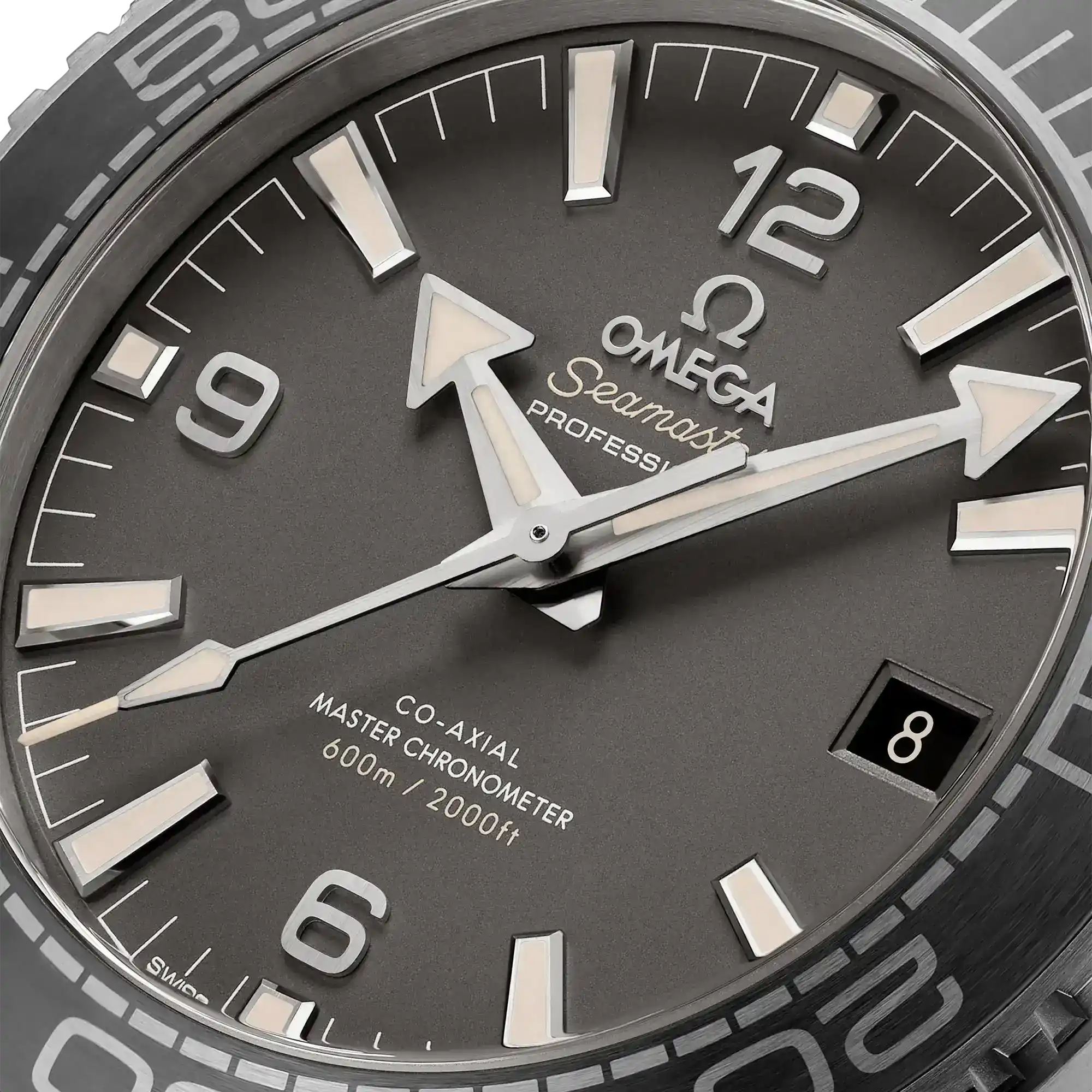 The dial is presented with a sand-blasted “gunmetal” grey galvanic treatment and includes a date window at 3 o’clock, along with transferred words in beige and white. The OMEGA logo, Arabic numerals, hands, and hour markers are all in PVD stainless steel with a brushed finish, while the beige Super-LumiNova improves visibility in dark conditions.