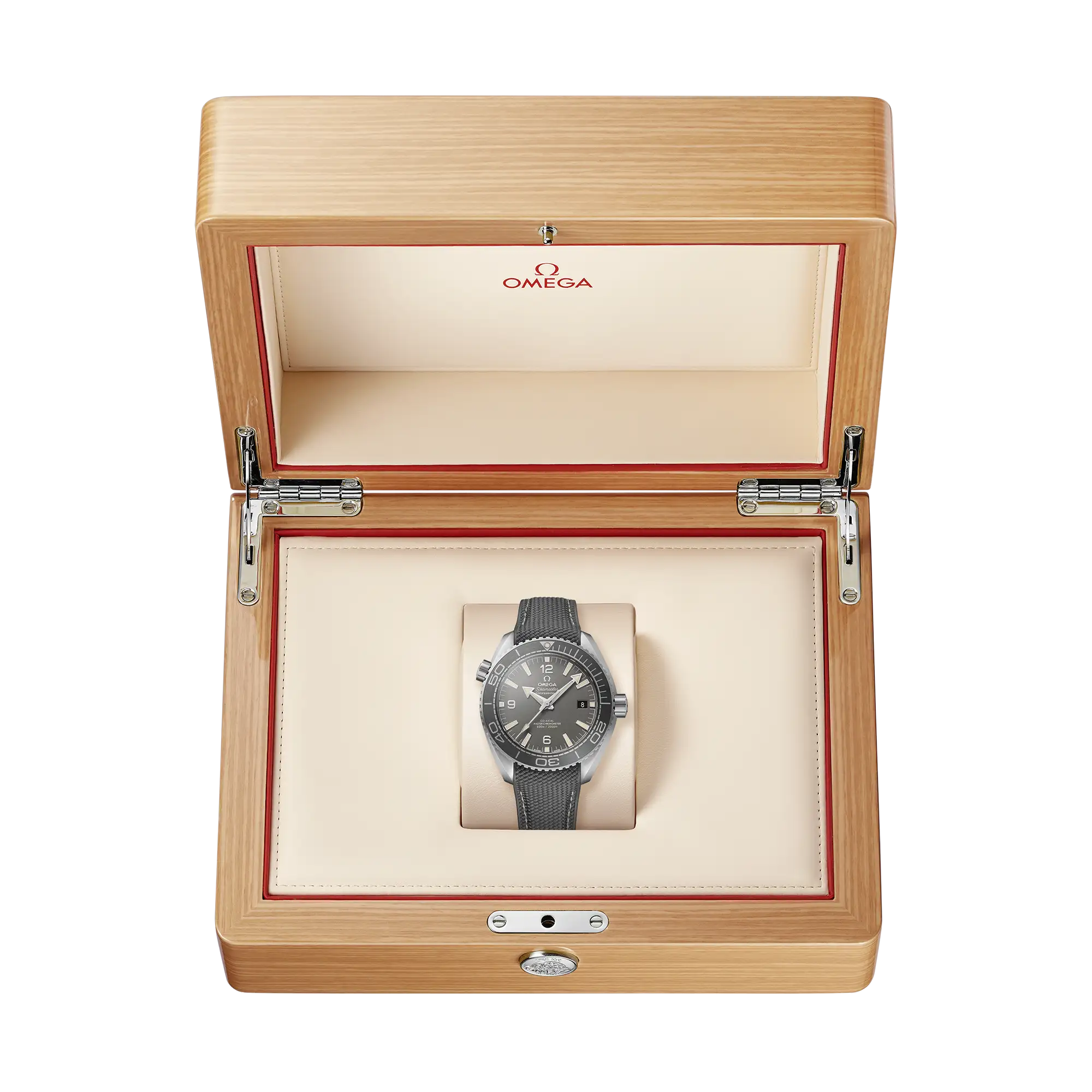 Powered by the Co-Axial Master Chronometer Calibre 8900, this Seamaster Planet Ocean is worn on an integrated dark grey rubber strap with a structured pattern and beige and dark grey stitching. The NAIAD LOCK caseback is completed with a metallized seahorse on the sapphire crystal.