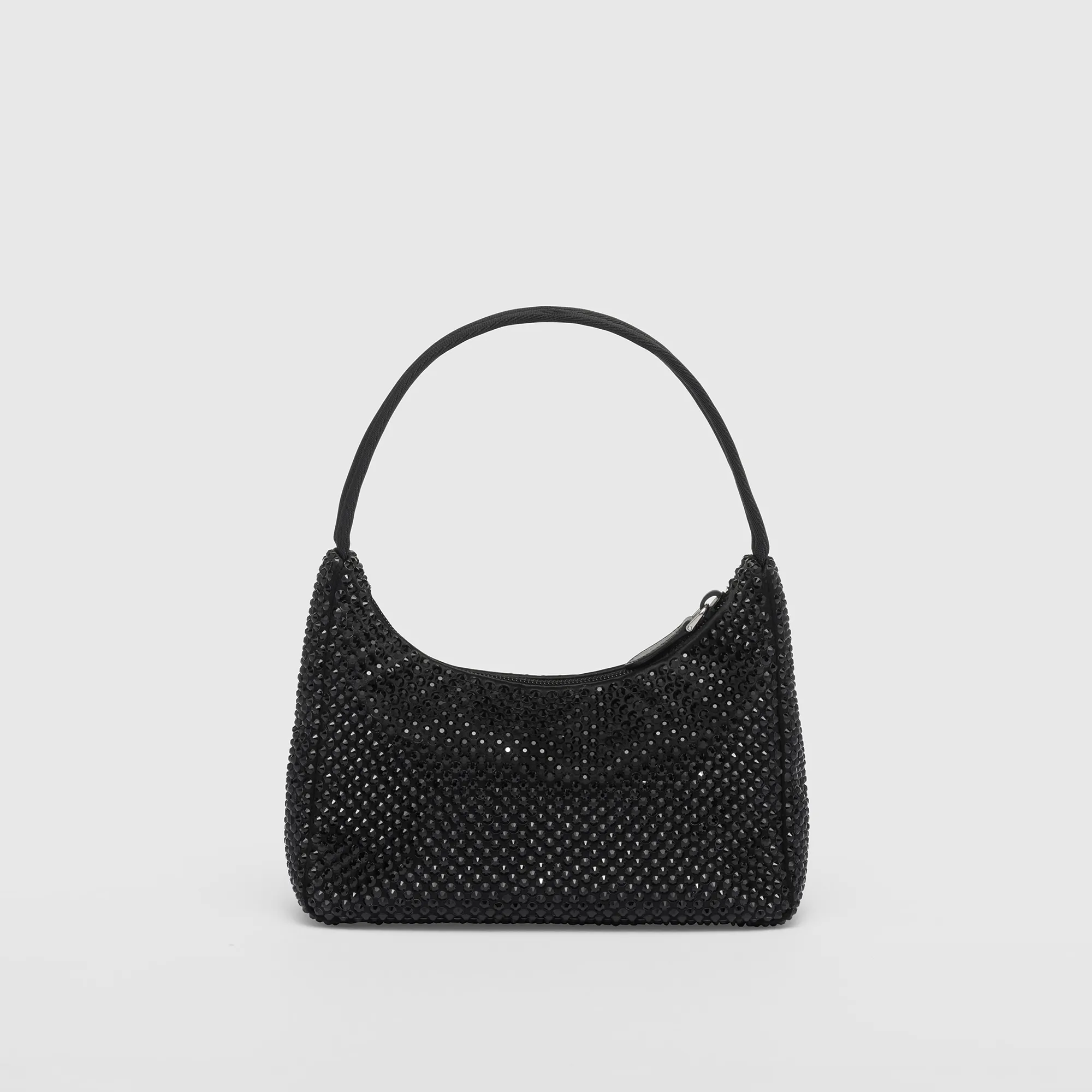 This mini hobo bag, an iconic Fake Prada style, comes in a luxurious satin version studded with crystals and decorated with the emblematic enamel triangle logo.