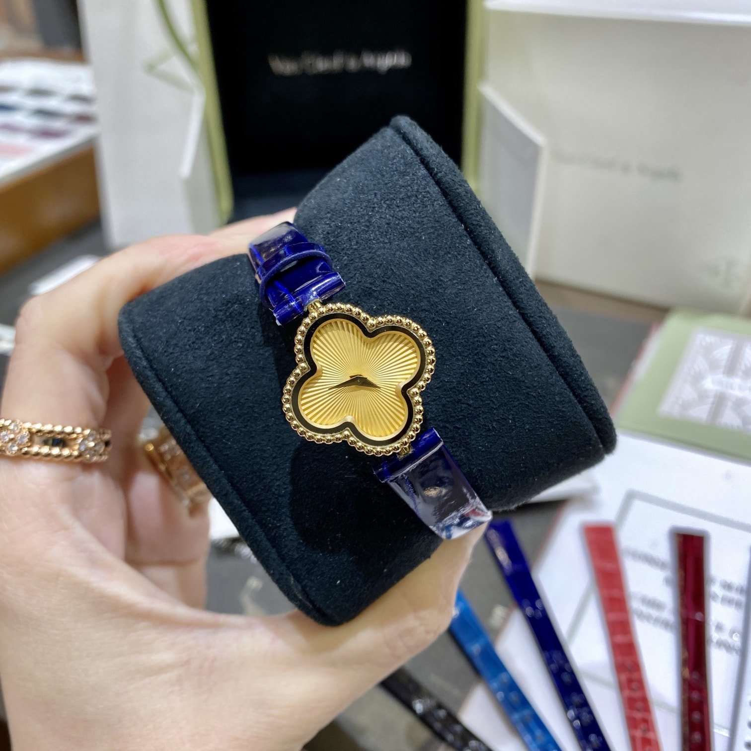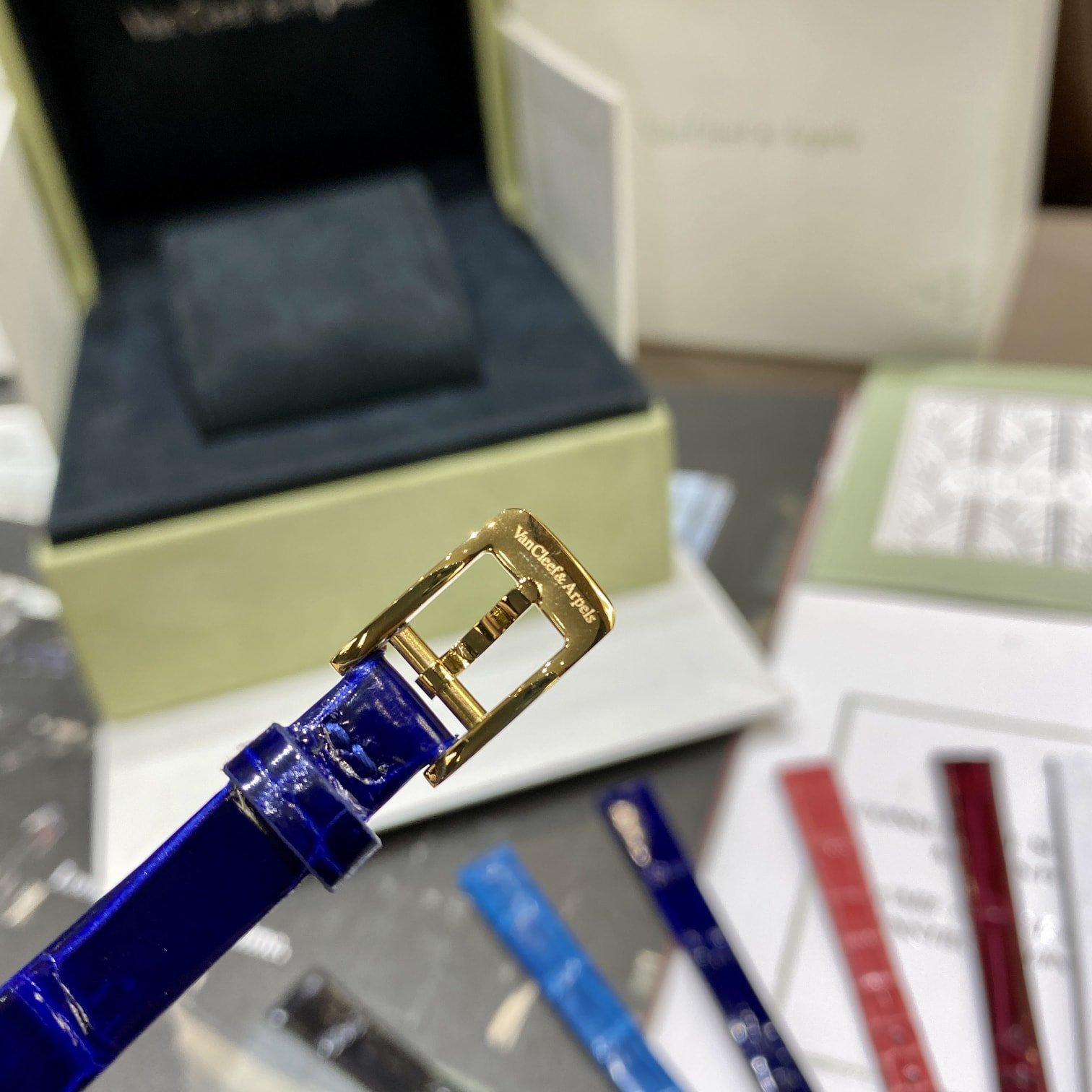 22.7 x 22.7 mm 18K yellow gold case; 18K yellow gold bezel; guilloche 18K yellow gold dial; interchangeable glossy VCA blue alligator strap; interchangeable 18K yellow gold pin buckle; quartz movement